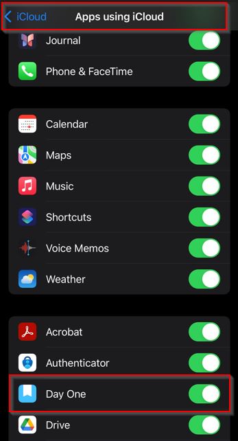 - Disable Text-Only Backups: If you prefer not to have duplicate backups, you can disable Day One in “Apps using iCloud” and rely on the comprehensive iCloud device backup along with Day One Sync.