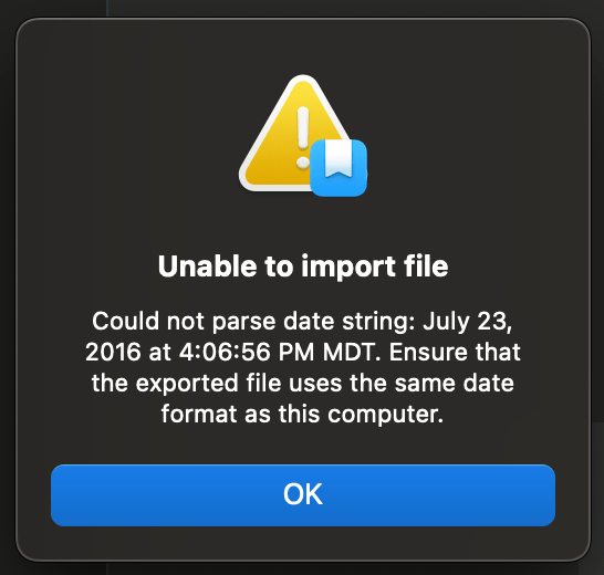 However, if you are trying to import a file that was produced on a computer in a different region (as the sample file on Day One’s website might be), or if you have changed the region settings on your computer since the export was produced, it is possible that the app may not be able to understand the date correctly. There is room for further improvement here, and we’ll file it for further improvement, but we do expect that exporting and importing the same text file on the same computer should work.