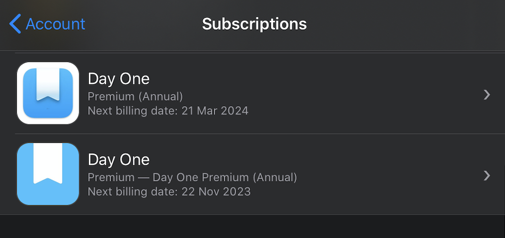 Please cancel one of these as soon as possible. I would suggest canceling the top one in your reply, as Apple may be able to issue a refund for that purchase. https://dayoneapp.com/guides/premium-subscription/view-change-or-cancel-your-premium-subscription.